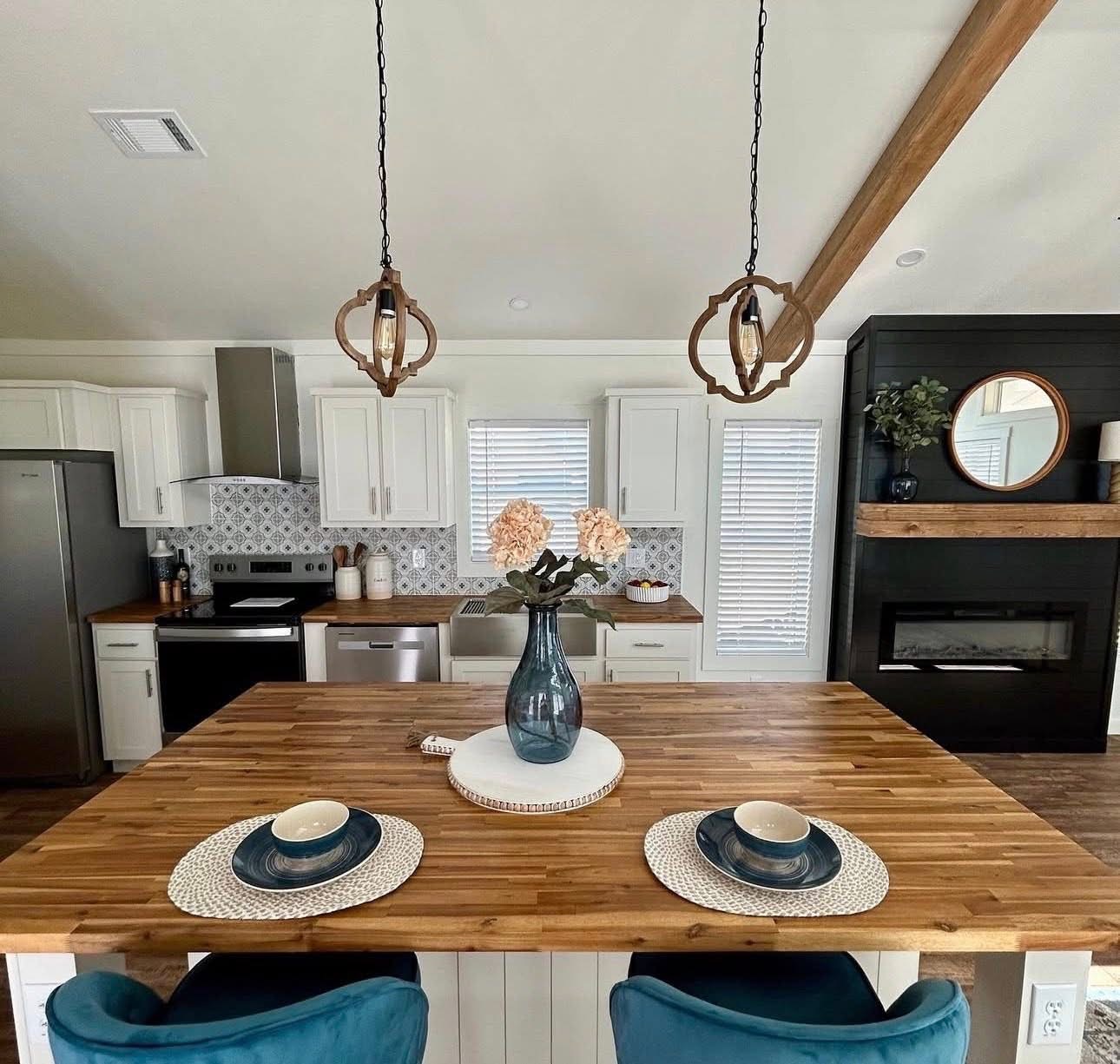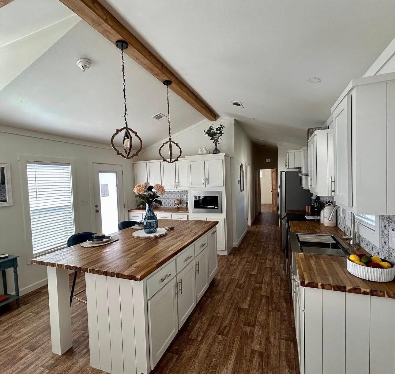 • Elegant butcher block countertops for a warm, modern kitchen look.